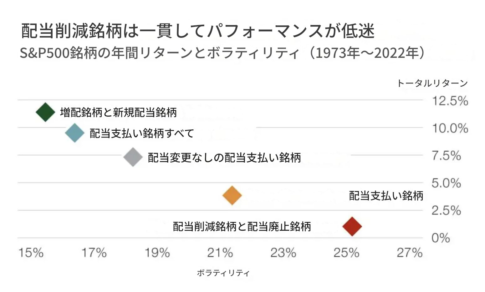 実際、配当を減らした企業は、その後5年間でS&P500種株価指数を平均で15%も下回る傾向があります。